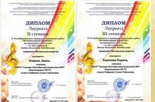 Поздравляем победителей Республиканского конкурса творческих работ "Музыкальная палитра": диплом лауреата второй степени Боярова Диана, диплом лауреата третьей степени - Каримова Карина ( учитель музыки Нафикова Гульназ Райхановна)