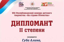 Учащаяся Татнефть-класса Губа Алина (9А) стала дипломантом II cтепени VIII Республиканского конкурса детского творчества "На страже Отечества" (учитель русского языка и литературы Сергеева Ирина Юрьевна).