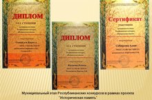 -дипломом III степени муниципального этапа Республиканского конкурса “Историческая память” в номинации “Листая страницы истории школы” награжден Самойлов Кирилл (педагоги Кириченко О.М., Глухарева И.С.),