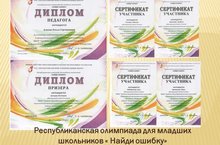Поздравляем победителей и участников Республиканской олимпиады для младших школьников « Найди ошибку»: диплом призера –Цынцарь Виктория(СОШ №6,4 Б), сертификаты –Артемьева Юлия, Хабибуллина Алсу, Гилязева Аделина, Ахметова Альбина, (СОШ№6, 4 Б). Дипломом педагога награждена Алиева О.Г.