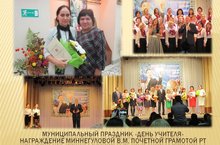 Большой праздник, посвященный Дню учителя, прошел во Дворце творчества детей и молодежи им И.Х.Садыкова. Учителя не только принимали поздравления, но и показали свои таланты. В этот день прошел Гала-концерт конкурса «Творческая панорама», фойе Дворца было оформлено лучшими художественными и декоративно – прикладными работами педагогов города. По итогам конкурса «Творческая панорама – 2016» педагог – организатор нашей школы Галиуллина А.С. стала дипломантом второй степени в категории «Художественное слово». На празднике были вручены награды и грамоты. Грамотой Министерства образования и науки РТ награждены учитель математики нашей школы Миннегулова В.М.