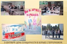 В соответствии с ФЗ от 13.03.95 № 32-ФЗ «О днях воинской славы (победных датах) России», п. 2.13 Комплексного плана противодействия идеологии терроризма в РФ на 2013 -2018гг, а также в целях консолидации жителей РТ в деле противодействия терроризму и формирование неприятия идеологии насилия, во исполнения приказа управления образования № 388 от 31.08.2016 в нашей школе были проведены мероприятия в рамках Дня солидарности в борьбе с терроризмом. На первом этаже школы педагогом – организатором Галиуллиной А.С. была оформлена выставка детских рисунков «Нет террору!», классными руководителями 1 -11 классов были проведены уроки, посвященные трагедии в г. Беслан, дети и педагоги почтили минутой молчания всех погибших в этом теракте. Учащиеся 10 А класса в сопровождении классного руководителя Сабировой Р.Д. посетили монумент победы, где в этот день жители города, педагоги, учащиеся вспоминали всех, кто погиб при терактах.