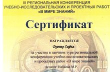 Поздравляем Дуенко Софью, за участие в заочном туре региональной конференции учебно – исследовательских и проектных работ «В мире знаний» (педагог Набиева М.Р.)