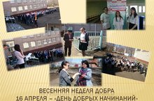 16 апреля 2016 года был дан старт добровольческой акции «Весенняя неделя добра – эстафета добрых дел». Этот день был посвящен Маршу добра, был «День добрых начинаний».Активисты ШСС торжественно объявили о старте акции, маршем прошлись по территории школы, провели флеш-моб, раздавали листовки прохожим с информацией об акции. Активное участие приняли обучающиеся 7 -8 классов, начального звена.