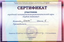 15 октября 2015 г. во Дворце творчества детей и молодежи имени И.Х. Садыкова прошла городская познавательно-развлекательная игра «Будем знакомы!» для активистов детских общественных организаций нашего города. Мероприятие организовано отделом по работе со старшеклассниками и детскими общественными организациями с целью расширения знаний учащихся о детских общественных организациях, развития творческих и интеллектуальных способностей учащихся. В игре приняли участие 9 команд 2-4 классов из школ №№ 1, 2, 6, 9, 11, 16, 31, 33, гимназии № 34. Ведущие вместе с активистами школ отправились в увлекательное путешествие по океану детских общественных организаций. Посетили остров знакомства, где ребята представили свои команды. Побывали на заколдованном интеллектуальном острове, где активистов поджидали пираты и настоящий морской бой! Ребятам необходимо было не просто найти спрятанные корабли, но и ответить на вопросы. Заключительной точкой путешествия оказался остров творчества, где ребятам надо было проявить свое воображение и фантазию.Нашу школу предствавили учащиеся 4 "А"класса (кл. рук. Набиева М.Р.) и учащиеся 7 "Б" класса (кл. рук. Гимадеева Л.М.)
