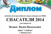 Поздравляем Победителей Всероссийской игры - конкурса по ОБЖ "Спасатели - 2014" Федяева Вадима, Биккулова Ильсура. Сертификаты участников получили : Шоносратов Мустафо, Пискунов Артем, Закирова Аделина, Слепова Вика, Давлетшин Салават, Шамилова Диана, Мартынова Кристина, Дуенко Софья. (педагог Набиева М.Р.)