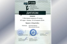 Учащиеся 11класса Кузнецов Денис и Минниханов Руслан принимали участие в V фестивале проектов «IT-Jump», проходившем в ИТ-парке г.Казани 13-14 апреля 2014 г.Они работали над проектом « i Visual info».В данном фестивале ребята награждены дипломом призера. Молодцы! Поздравляем!!!