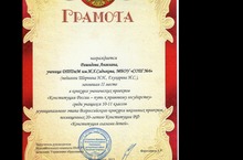 Поздравляем Рашидову Ангелину, ученицу 10 "А" кл. МБОУ "СОШ №6" , члена Городского Совета старшеклассников, занявшую II место в конкурсе ученических проектов "Конституция России - путь к правовому государству" среди учащихся 10-11 классов муниципального этапа Всероссийского конкурса школьных проектов, посвященных 20-летию Конституции РФ "Конституция глазами детей".