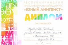 Ученицы 4 класса Бухарова Диана (1 место) и Насибуллина Ясмина (3 место) стали победителями В Республиканском интеллектуальном конкурсе "Юный лингвист" и награждены Дипломами Министерства образования и науки РТ.