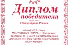 Дипломами победителя награждены: ученица 6 класса Габдулбарова Регина и ученица 10 класса Пушканова Светлана, занявшие 3 место во II Всероссийском дистанционном блиц-турнире по английскому языку "Rainbow".