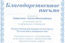Благодарственным письмом ЦДМ Фактор Роста награждена Хайруллина Чулпан Минталибовна за активное участие в организации и проведении Всероссийской дистанционной викторины "Путешествие в затерянный мир".
