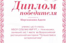 Ученица 4 класса нашей школы Миргазизова Аделя награждена Дипломом победителя за 1 место во Всероссийской дистанционной викторине "Путешествие в затерянный мир".