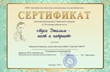 Ученик 6В класса Файзуллин Марсель принял участие в Региональном творческом конкурсе к 120-летнему юбилею поэта "Муса Джалиль - поэт и патриот" (учитель Сергеева Ирина Юрьевна).