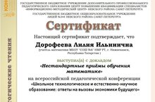 Учитель математики Дорофеева Лилия Ильинична выступила с докладом "Нестандартные приёмы обучения математике" на Всероссийской педагогической конференции "Школьное технологическое и естественно-научное образование: ответы на вызовы экономики будущего" (г. Санкт-Петербург).