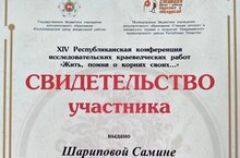 Обучающаяся 3А класса Шарипова Самина приняла участие в Республиканской конференции исследовательских, краеведческих работ "Жить, помня о корнях своих..." (учитель Ильязова Гульназ Наилевна).