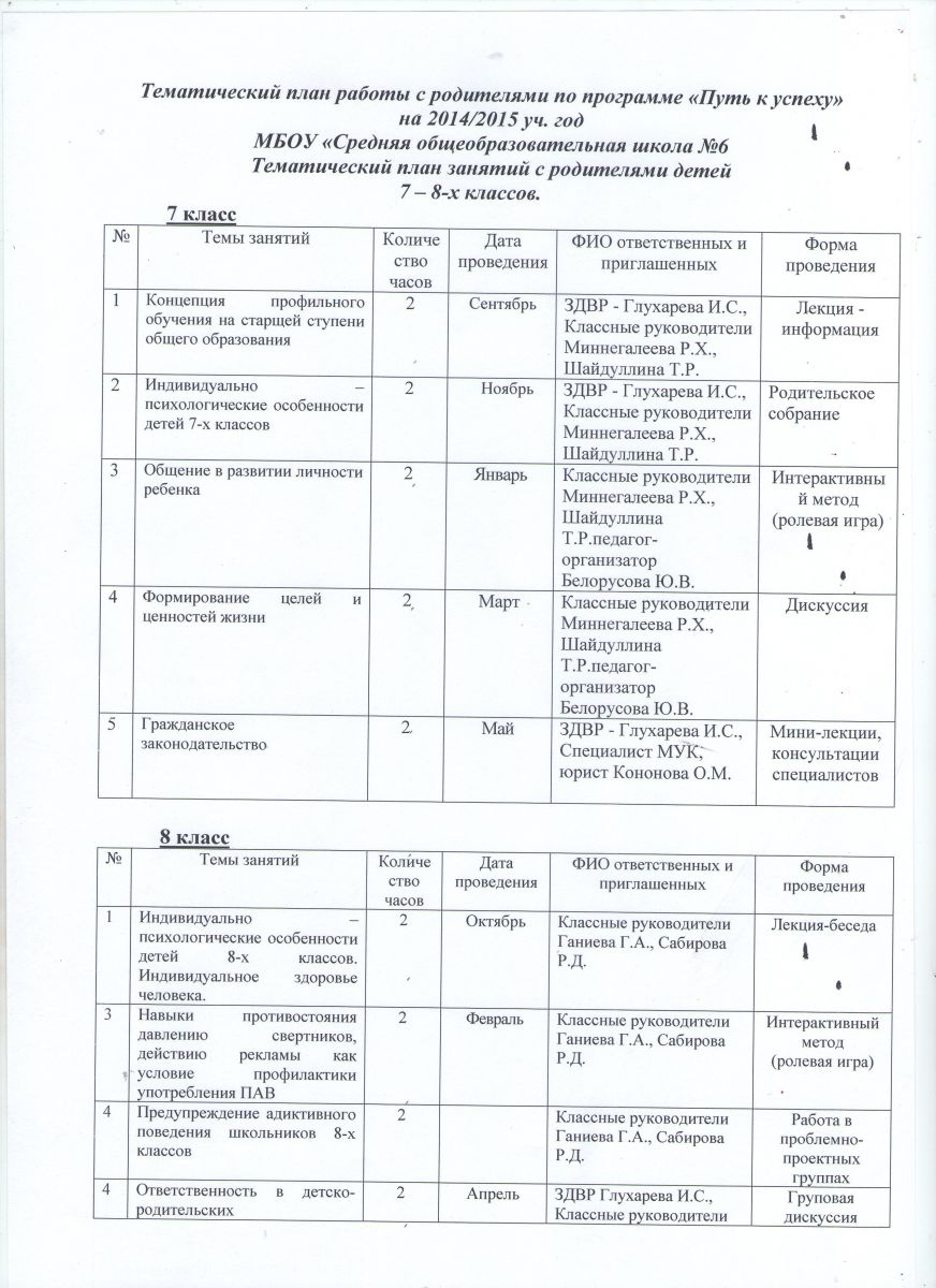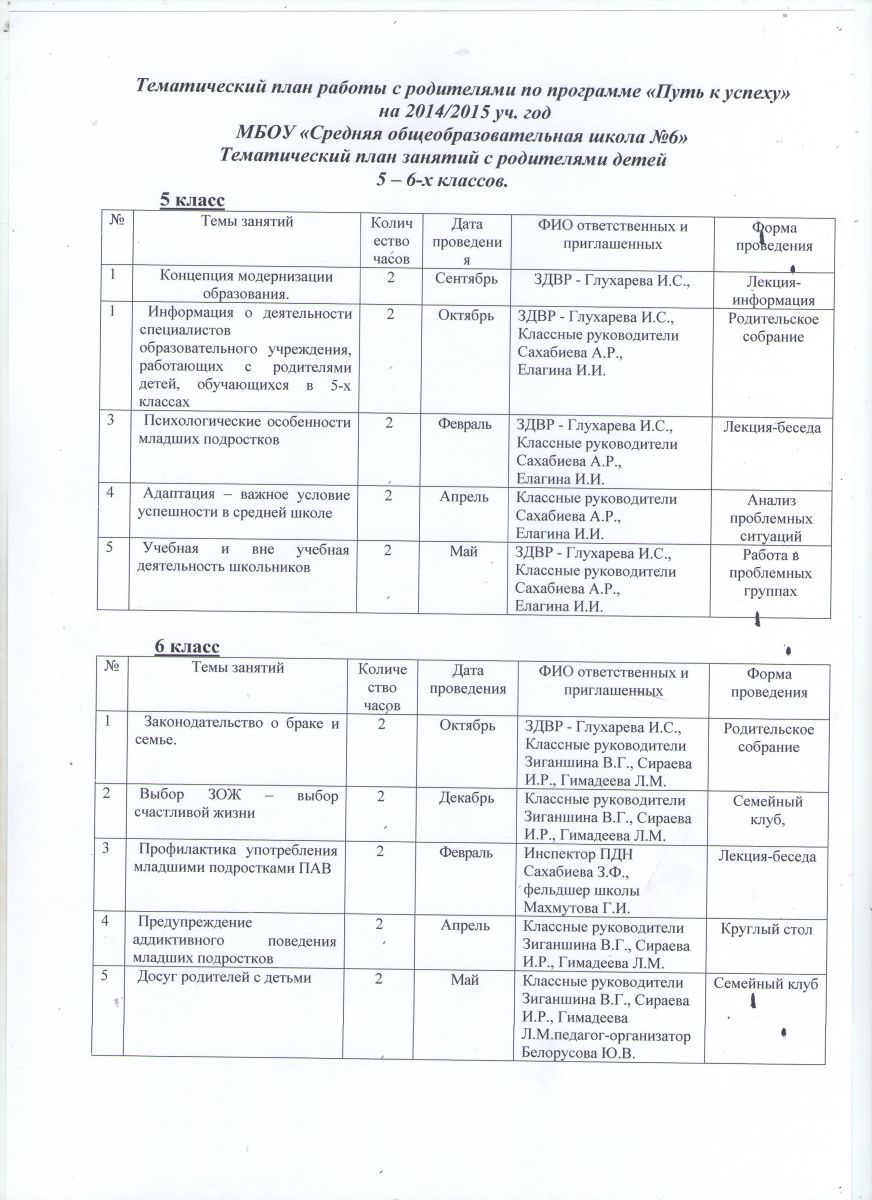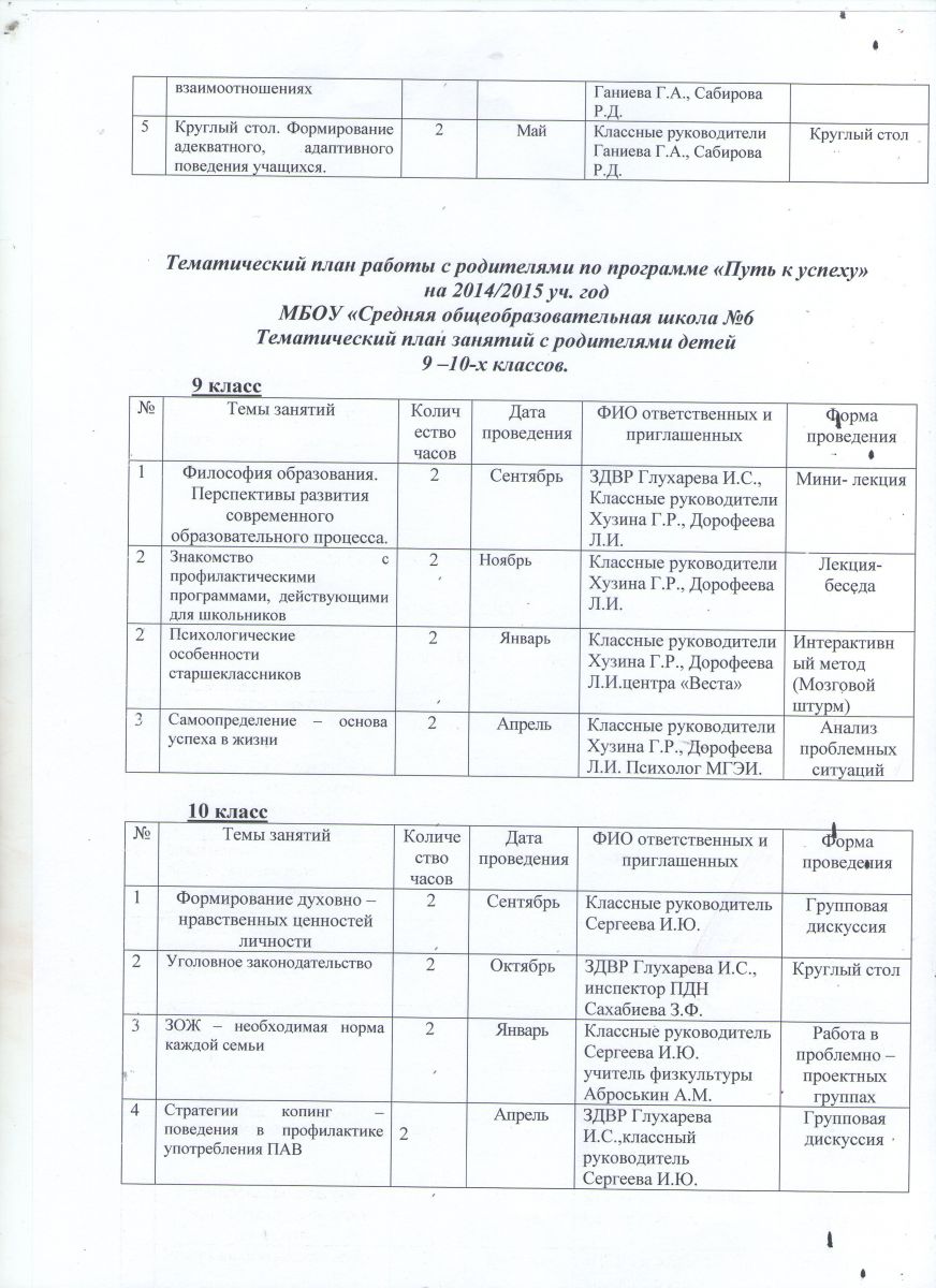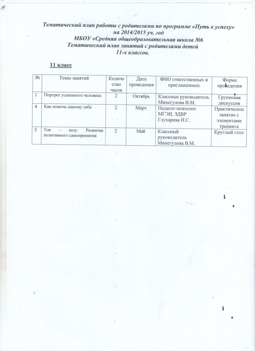 Тематический план работы с родителями по программе "Путь к успеху" на 2014-2015 учебный год