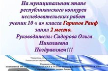 Поздравляем Гарипова Раифа ученика 10 а класса с очередной победой! В муниципальном конкурсе исследовательских работ посвященное 100 — летию образованию ТАССР, его работа была признана одной из лучших. Молодец!!!