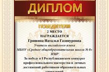 Учитель английского языка Гришина Н.Г. получила Диплом победителя за 2 место в Республиканском конкурсе профессионального мастерства и личных достижений работников образовательных учреждений "Потенциал" в номинации "Методическая копилка".