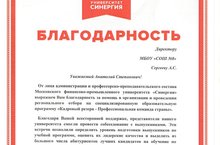 от лица администрации и профессорско-преподавательского состава Московского финансово-промышленного университета "Синергия" выражается директору нашей школы Сергееву Анатолию Степановичу за помощь в организации и проведении регионального отбора на программу "Кадровый резерв - Профессиональная команда страны", а так же за студентку Гиждеван Анну - выпускницу нашей школы.