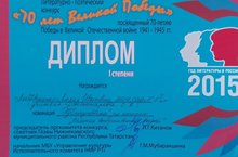 19 мая в Педагогическом колледже города победителям литературно-поэтического конкурса, посвященного 70-летию Победы в Великой Отечественной войне и Году Литературы в России, вручались дипломы и призы. Ученица 8-го класса нашей школы Литвиненко Лилия (руководитель: Джаппарова С.К.) награждена Дипломом I степени в номинации "Публицистика" за статью "Великая Отечественная война".