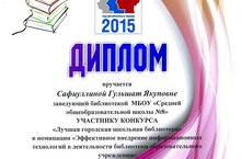 Заведующая библиотекой МБОУ «СОШ № 8» Сафиуллина Гульшат Якуповна получила Диплом участника конкурса «Лучшая школьная библиотека» в номинации «Эффективное внедрение информационных технологий в деятельности библиотеки образовательного учреждения».