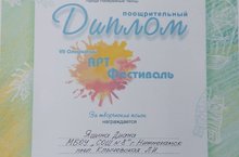 На VII Открытом Арт-Фестивале в г.Наб.Челны наша ученица Яшина Диана (руководитель: Клычевская Л.И.) награждена Дипломом за творческий поиск.