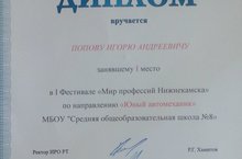 По итогам I Фестиваля профессий "Мир профессий Нижнекамска" Попов Игорь - ученик 9-го класса нашей школы занял I место по направлению "Юный автомеханик" и получил Диплом.