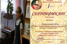 23 октября 2014 года ученица 2-го класса Баринова Яна (кл.руководитель: Чумакова О.Н.) приняла участие в городском конкурсе чтецов, посвящённом 200-летию со дня рождения М.Ю. Лермонтова.