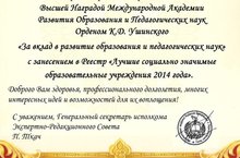 Администрация Федерального электронного Реестра "Доска почета России" на основании Положения за № 1001 от 15.08.2014 г. приняла решение наградить директора нашей школы - Сергеева Анатолия Степановича, как профессионала в своей области, Высшей Наградой Международной Академии Развития Образования и Педагогических Наук Орденом К.Д. Ушинского «За вклад в развитие образования и педагогических наук» с занесением в Реестр «Лучшие социально значимые образовательные учреждения 2014 года».