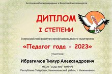 Педагог - организатор МБОУ "СОШ №9" НМР РТ Ибрагимов Тимур Александрович участвовал во Всероссийском конкурсе профессионального мастерства «Педагог года - 2023» за участие в котором он получил диплом I Степени за конкурсную работу: Патриотический конкурс на лучшее исполнение гимнов Российской Федерации и Республики Татарстан. Поздравляем ! Гордимся ! Так держать !