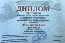 Учащиеся 9 Б класса приняли участие в Муниципальном конкурсе презентаций «Сердце помнит , бережно храня…», посвящённый 80- летию подвига Героя Советского Союза Н.Ф. Кайманова. Мамонтов Глеб получил диплом 3 степени, Асфандьяров Данис, Кузьменков Никита и Нуруллин Рамазан получили сертификаты участников ( руководитель М. Н. Кадриева).