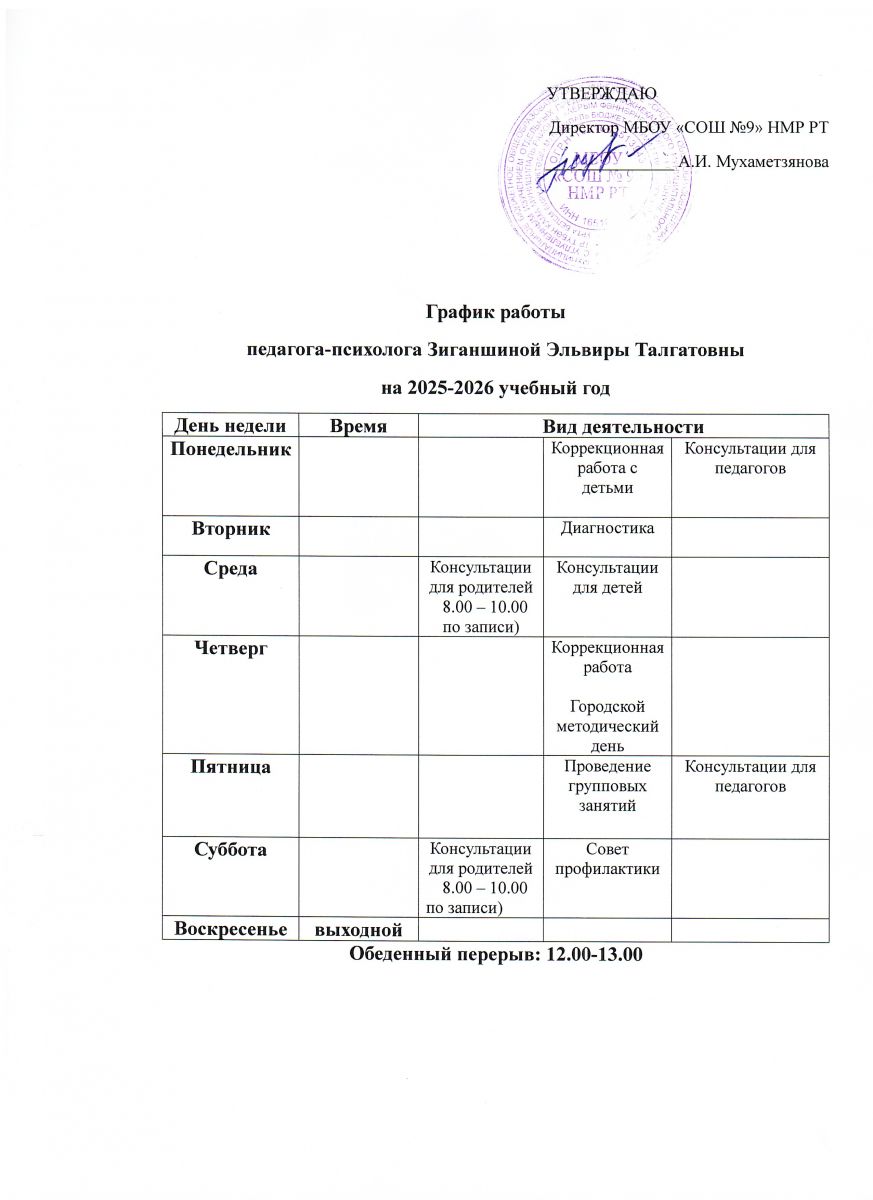 График работы педагога-психолога МБОУ «СОШ №9» НМР РТ