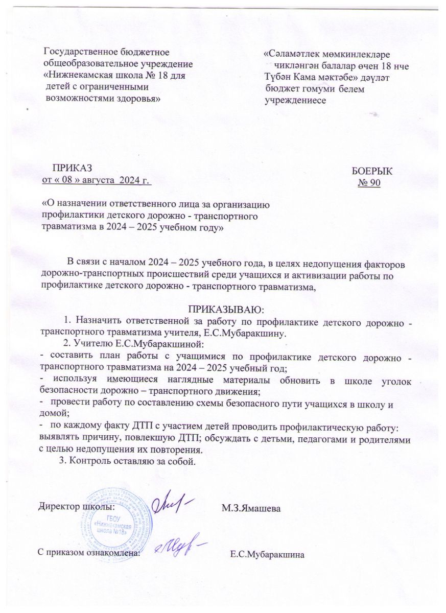 Приказ о назначении ответственного лица за организацию профилактики ДДТТ 2024-25 уч.г.