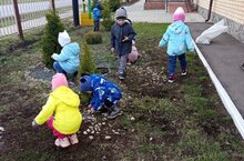 Общими усилиями начали очищать площадку старшей группы от прошлогодней травы и листьев, чтобы поскорей появилась новая травка!