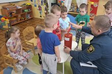 Сегодня к нам в детский сад приходил начальник отдельного поста противопожарной службы с.Сухарево Биряльцев В.А. Была проведена беседа по пожарной безопасности "Знакомство с огнетушителем".
