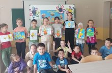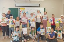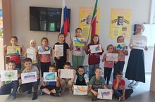 Балалар белән Нуретдинова А.Р. һәм лагерьда практика үтүче үзебезнең мәктәпне тәмамлаган, бүгенгесе көндә КФУ ның 3 курс студенты Ягудина Зөһрә 12 июнь - Россия көне уңаеннан рәсем ясатып күргәзмә оештырдылар.