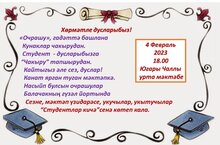 4 февраль көнне сәг.18.00 мәктәпнең актлар залында Студентлар кичәсенә көтеп калабыз!