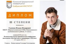 11 нче сыйныф укучысы Галимов И.И. КФУ филиалы Алабуга институты оештырган "ХХI гасырда рус теле һәм әдәбияты" региональ фәнни-гамәли конференциясендә катнашып 3 нче дәрәҗә диплом белән бүләкләнде 14.03.2021
