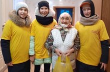 Волонтер кызлар - Ягудина Нурия (9 кл.), Хакимуллина Дилә (9кл.), Сафиуллина Алия (8 кл.) һәм Хакимуллина Фәзилә ялгыз яшәүче әбиләр өчен эшмәкәрләр әзерләгән азык-төлек наборы өләшергә ярдәм иттеләр. 16.11.2020