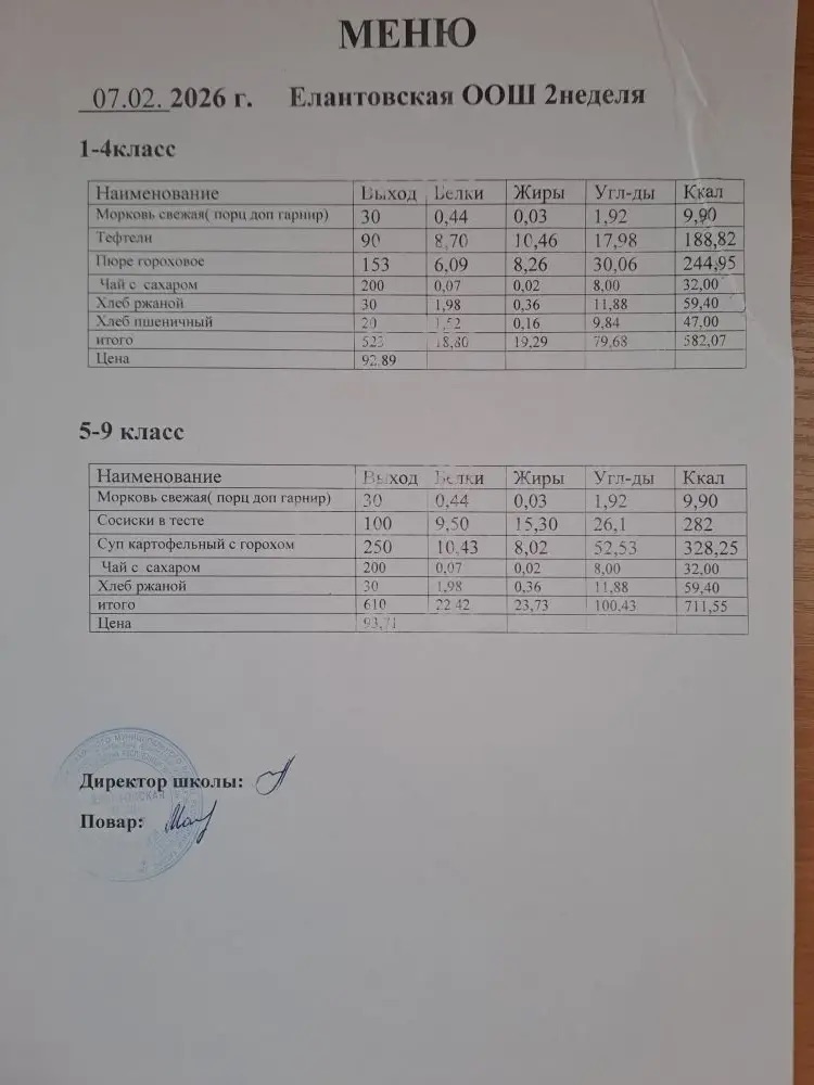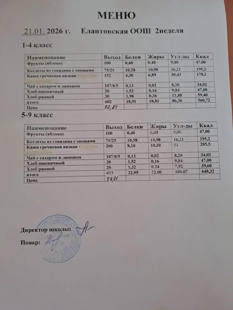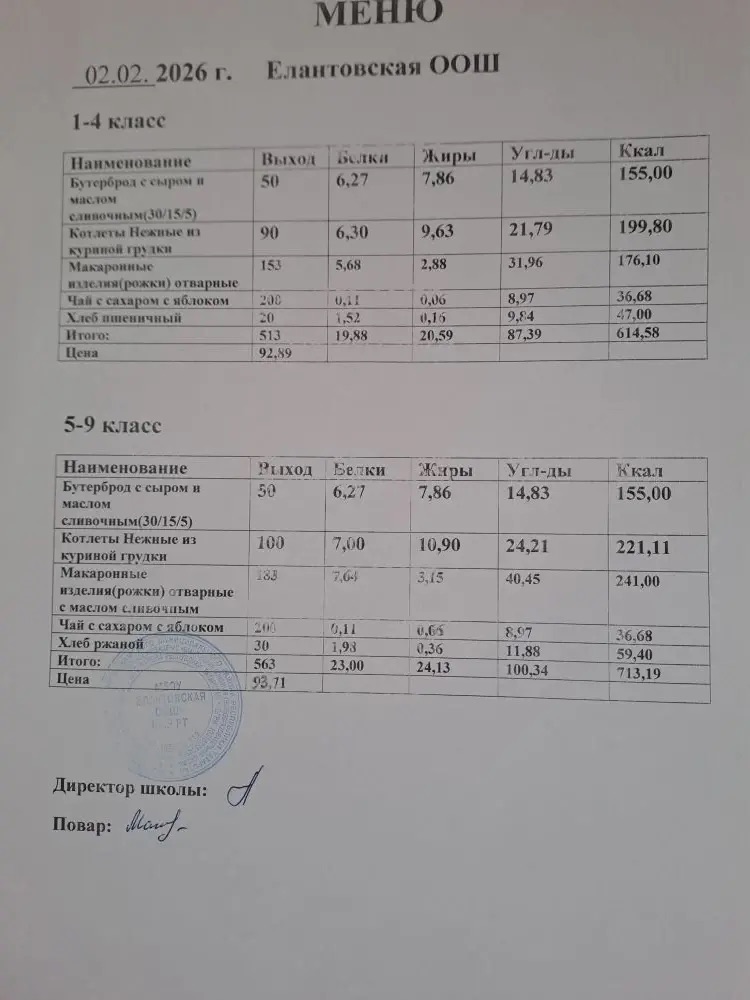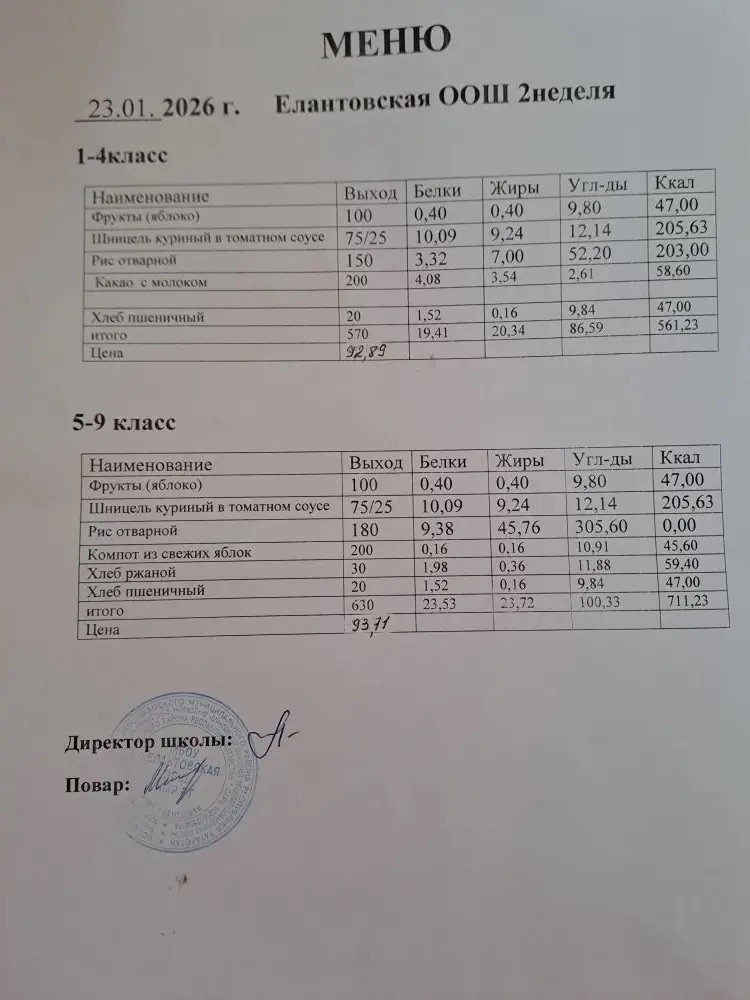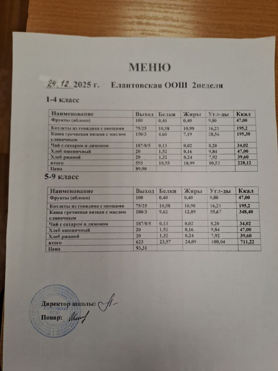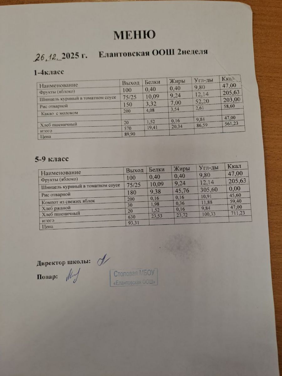 Двухнедельное меню для 1-4 классов c 1 сентября 2025 г.