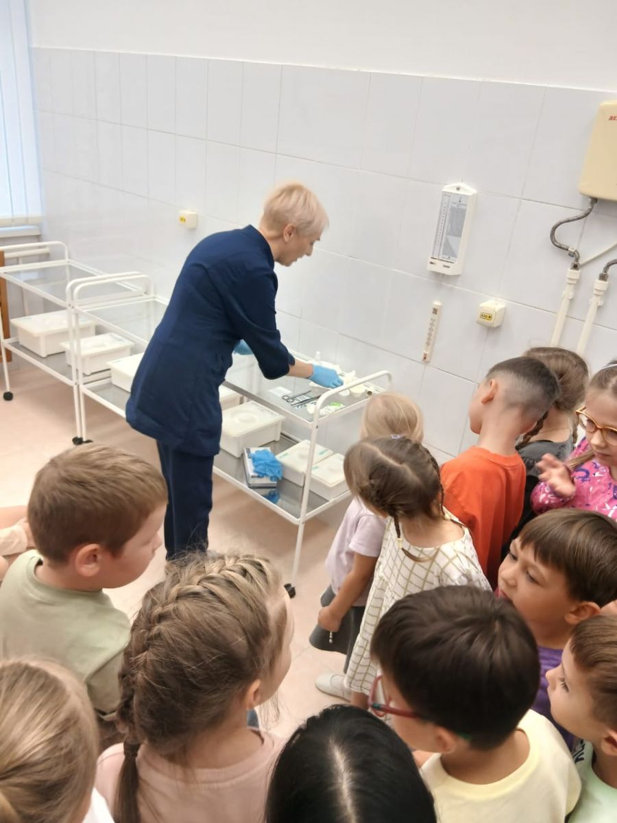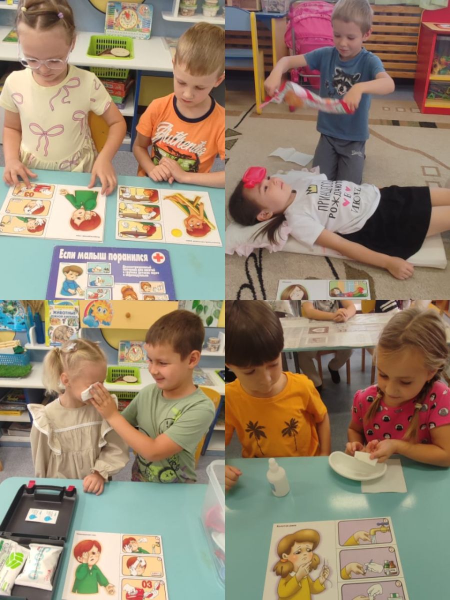 Для групп старшего и подготовительного возраста воспитатели провели занятия на тему «Оказание первой помощи». Цель: знакомить детей с элементарными приёмами оказания первой помощи. По итогам занятий дети посетили медицинский кабинет, где медсёстры в игровой форме показали детям как оказывают первую медицинскую помощь, обрабатывая рану.
