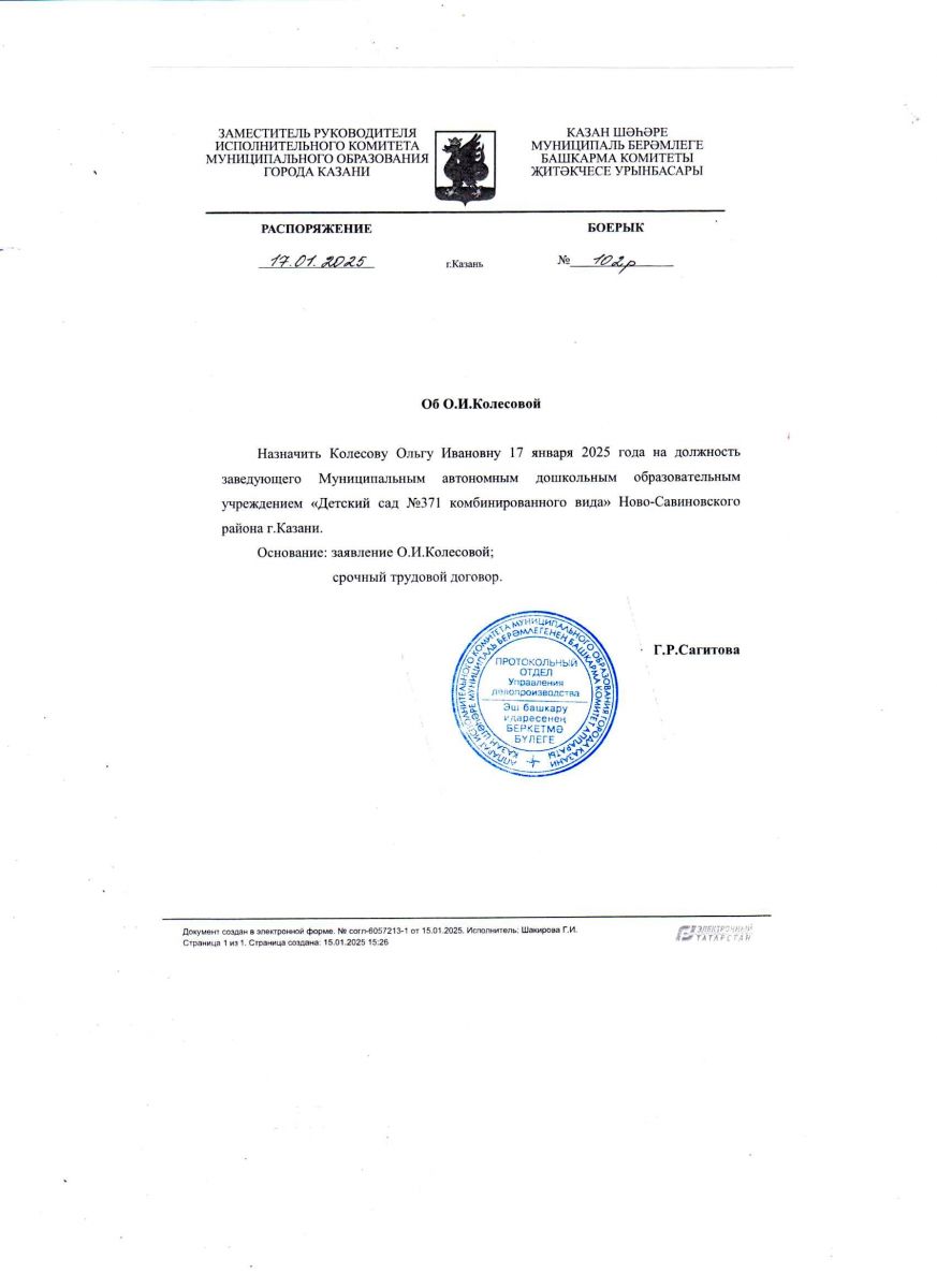 Приказ о назначении заведующей МАДОУ Детский сад № 371