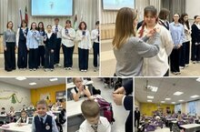 Затем в 3 классе обновили атрибутику Орлят России - ребятам вручили новые мешки для обуви, значки и игру в класс.