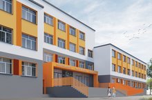В характерных для осени тёплых и красочных цветовых сочетаниях выполнены фасады и интерьеры школы.
