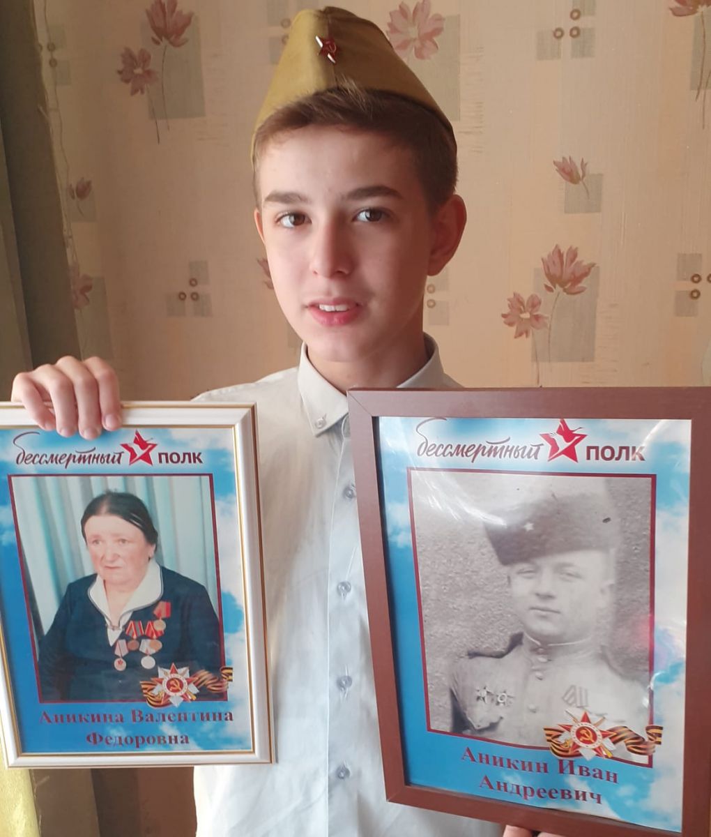 Аникин Ранель, ученик 6" Б" класса принимает участие в Бессмертном полку-онлайн и гордится своими прадедом и прабабушкой.