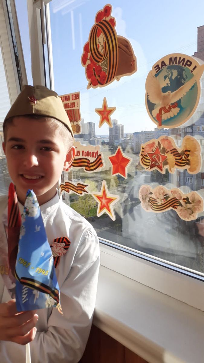 Аникин Ранель, ученик 6"Б" класса принимает участие в патриотической акции Окна Победы