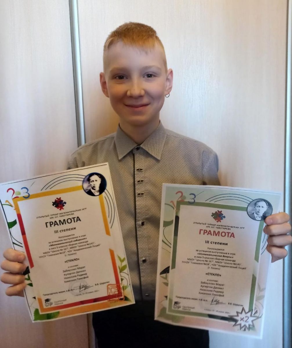 Поздравляем ученика 5"Б" класса Кутергина Даниила с Победой в Открытом турнире математических игр им. Н.Г. Чеботарева. Наши поздравления