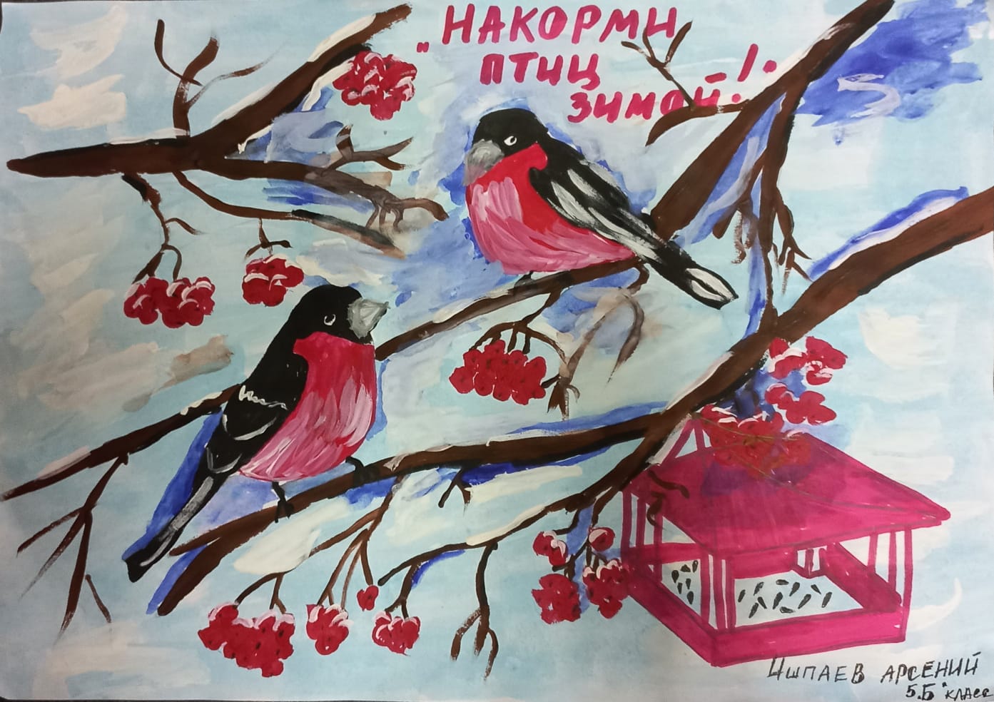 Ишпаев Арсений, ученик 5 "Б" класса принимает участие в экоконкурсе:"Накормим птиц зимой!" в номинации "рисунок".