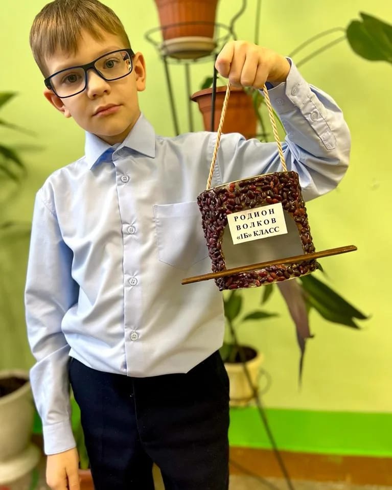 Волков Родион, ученик 1 "Б" класса принимает участие в экоконкурсе:"Накормим птиц зимой!" в номинации "кормушка".