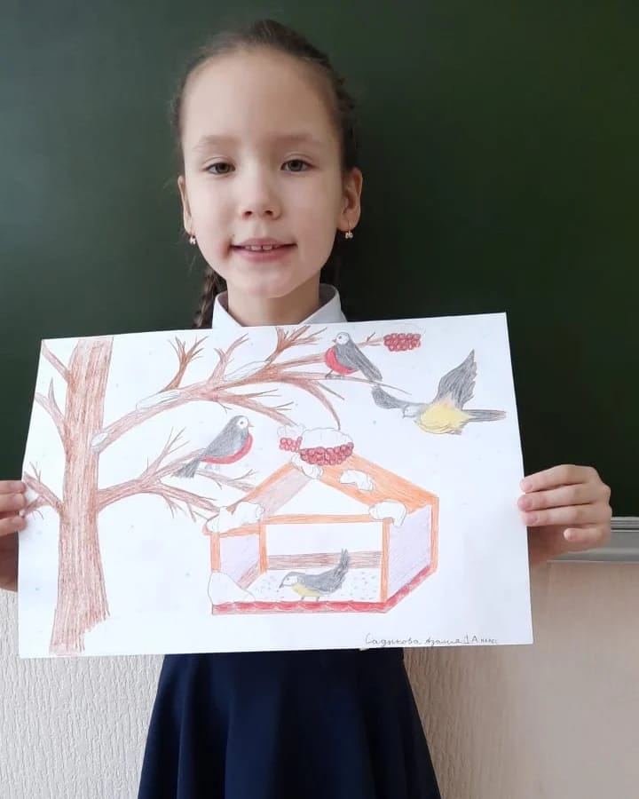 Садыкова Азалия, ученица 1"А" класса принимает участие в экоконкурсе :"Накормим птиц зимой! " в номинации "рисунок".